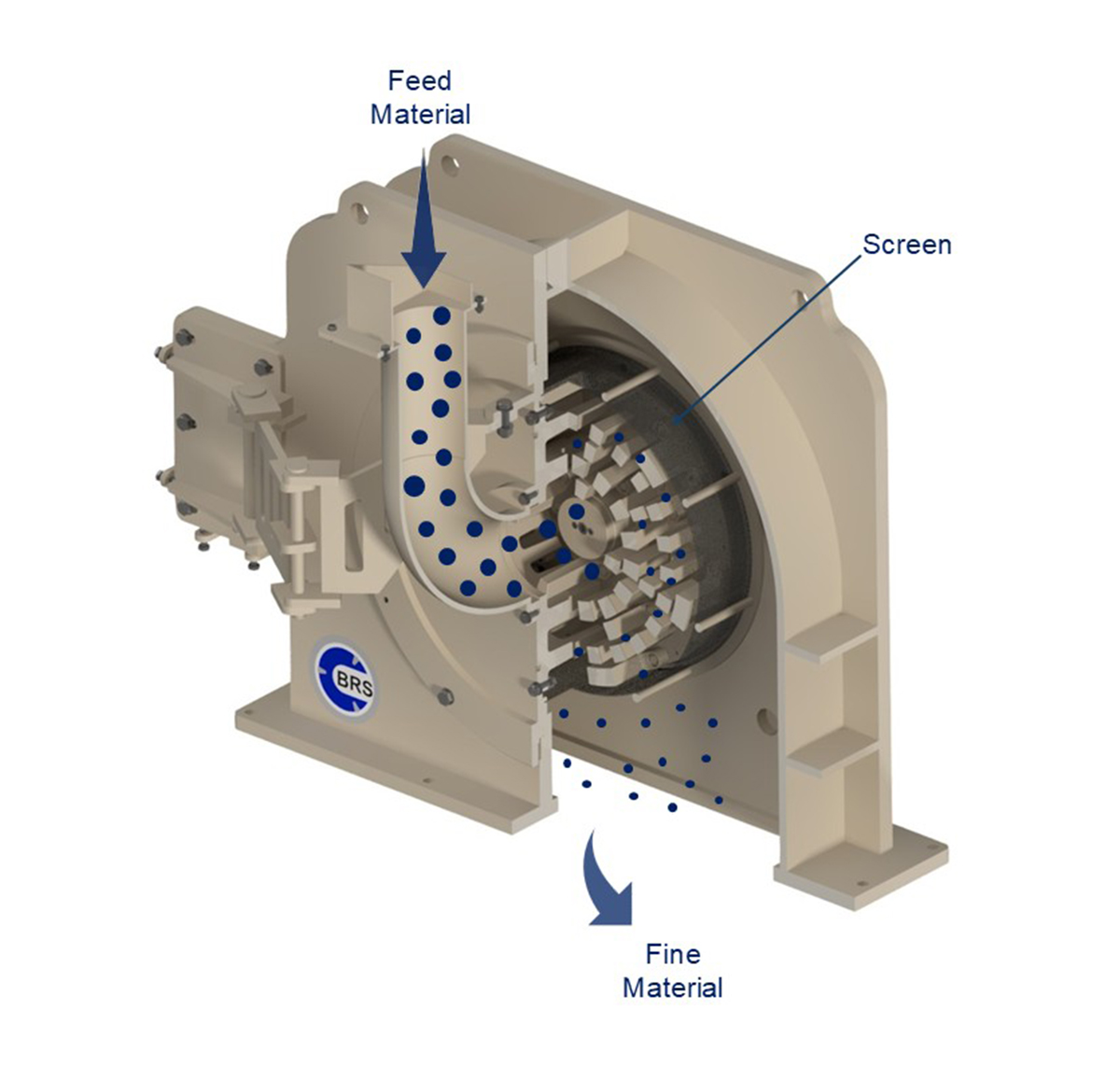 it is impacted by the high-speed rotating pins, which cause it to break down into fine particles.